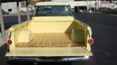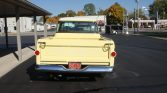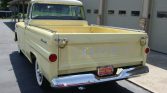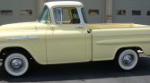 This 1958 Chevrolet Apache is a Fleetside pickup that was built in Los Angeles, California, and spent time in Arizona where it was refurbished under previous ownership in 2013 before being acquired by the seller in 2020. The truck is finished in yellow over brown and cream upholstery and is powered by a 283ci V8 paired with a column-shifted three-speed manual transmission. Features include chrome front and rear bumpers, Fleetside badging, wood truck bed trim, an AM radio, and 15″ steel wheels wearing Firestone wide-whitewall tires.