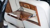 The interior is trimmed in Beige Connolly leather with Fawn carpeting. The burl wood dash is complemented by matching fold-down trays on the front seat backs and dual-grain wood door caps. The 3-spoke black steering wheel sits ahead of a column shifter, and power-assisted steering was equipped from the factory. Air conditioning is believed to be a later addition.