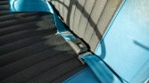 The cabin features front and rear bench seats trimmed in blue vinyl with patterned black and blue cloth inserts along with blue door panels and carpeting. Equipment includes a six-way electrically adjustable front seat, front lap belts, power windows, a clock, and a rear armrest. A Pioneer remote-control stereo is located beneath the front bench.