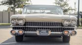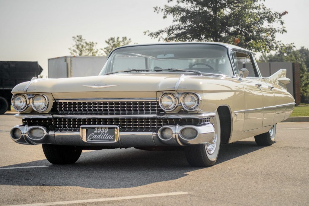 The Series 62 was restyled for 1959 with updated front and rear grilles, a Series 62-specific single-row rear grille, upright fins, and dual-bullet tail lights. This example was ordered in Beaumont Beige (44) with a white (12) roof, and the seller states that the bodysides were refinished at an unknown point during previous ownership. Additional equipment includes a left-side mirror, a power antenna, fender skirts, and reverse lights.