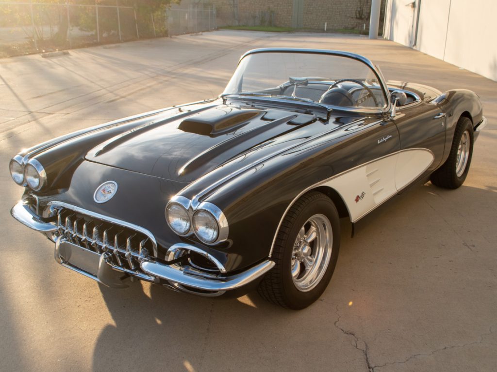 This 1959 Chevrolet Corvette was refurbished and modified during prior ownership, with work including refinishing the exterior in black with white coves as well as installation of a fuel-injected 5.7-liter L98 V8 and a six-speed manual transmission. Equipment includes power steering, a dual exhaust system, staggered-width 15″ American racing wheels, updated suspension components, and four-wheel disc brakes.