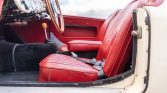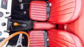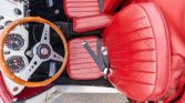The interior is trimmed with red upholstery, black carpets and floor mats, and a body-color dashboard. Additional features include lap belts, a cockpit heater, and a three-spoke steering wheel with a wooden rim.