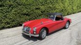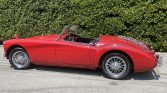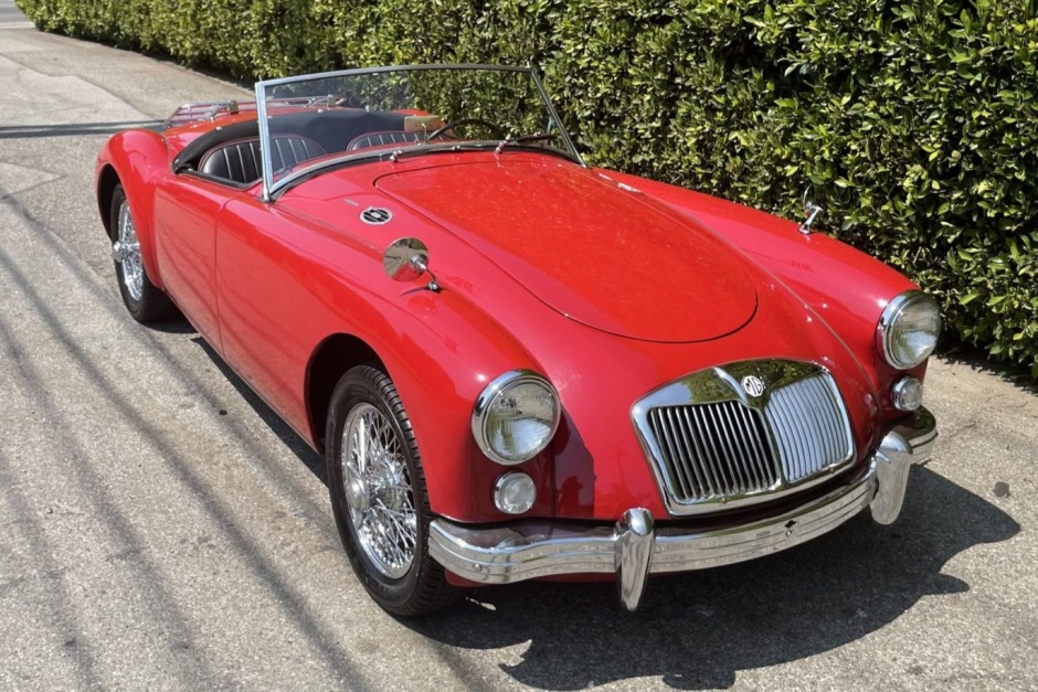 This 1960 MG MGA 1600 Roadster is finished in red over black vinyl upholstery and is powered by a 1.6-liter inline-four paired with a four-speed manual transmission. Features include a black soft top, a chrome luggage rack, 15″ chrome-finished wire wheels, fender-mounted side-view mirrors, and an oversized aftermarket radiator. The car is said to have been refurbished during previous ownership and was acquired in June 2019 by the seller. Work has since included installing a battery cut-off switch, overhauling the distributor, and an oil change.