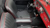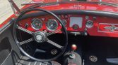 The seating surfaces have been reupholstered in black vinyl with red piping, and MG-branded mats cover the matching carpets. Amenities include a heater, two-point seat belts, an armrest, a dashboard-mounted rearview mirror, and a wood shift knob.