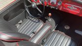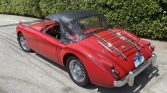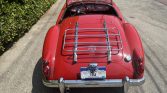 The car is finished in red with chrome bumpers with overriders, fender-mounted side-view mirrors, a luggage rack mounted on the rear decklid, and a black soft top.