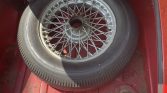Chrome-finished 15″ knock-off wire wheels are wrapped in 185/60 Nexen CP641 tires. The front disc and rear drum brakes were adjusted in May 2021. Wear is present on the wheel center locks.