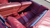 The cabin features two-tone red vinyl upholstery with a matching dashboard, carpets, and door panels. Equipment includes a power-adjustable split-folding front bench seat, power windows, dual sliding sun visors, and a Wonder Bar AM radio. The left turn signal does not automatically reset and the analog clock and rear speakers do not work.