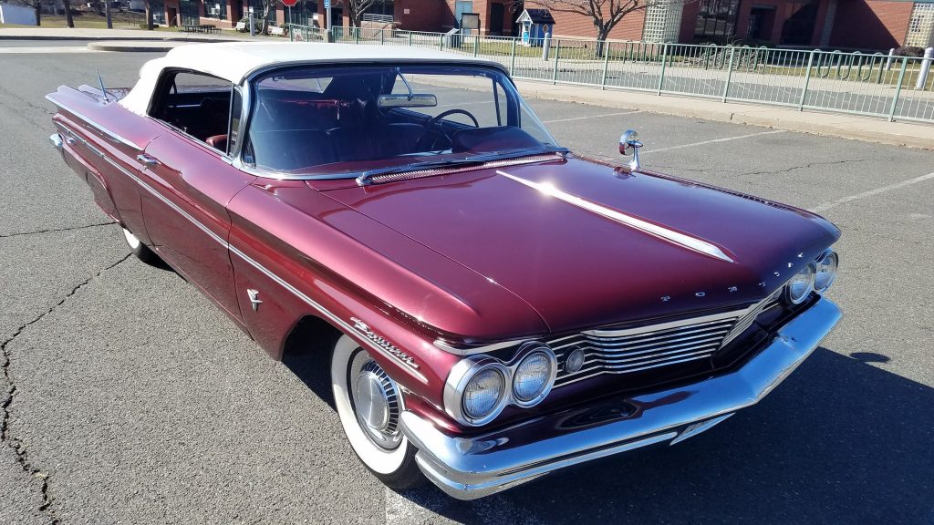 This 1960 Pontiac Parisienne is a Canadian-market convertible that was sold new by Grant Brown Motors in Toronto, Ontario, and was acquired by the seller circa 2005. The car is finished in metallic red over a red vinyl interior and is powered by a 283ci Turbo-Fire V8 paired with a two-speed automatic transmission. Factory equipment includes a power-retractable soft top, power-adjustable front bench seat, power windows, power brakes, and a Wonder Bar AM radio.