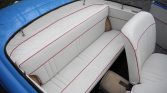 The four-place cockpit is trimmed in white vinyl with red piping, while black and tan carpets line the floors. Amenities include blue-tinted plexiglass sun visors, map pockets, wind-up windows, a floor shifter, and a heater.