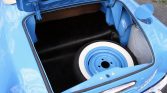 Body-colored steel wheels wear chrome “winged arrow” hubcaps and 165R15 Coker Classic wide-whitewall tires. A matching spare is housed in the trunk. Branded mudflaps protect the bodywork at the rear. The white convertible roof can be removed or stowed behind the seats.