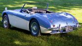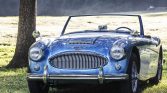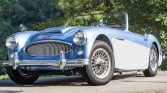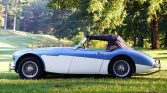 This 1961 Austin-Healey 3000 is a four-seat BT7 roadster that was built in November 1961. The car is finished in two-tone metallic blue and cream white over black leather upholstery, and power comes from a replacement 2.9-liter inline-six paired with a four-speed manual transmission with overdrive. Features include dual SU carburetors, an electric cooling fan, front disc brakes, a stainless steel exhaust system, a black soft top and side curtains, and a Moto-Lita steering wheel.