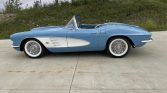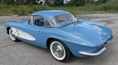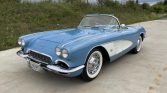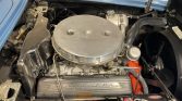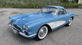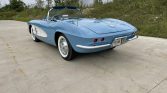 This 1961 Chevrolet Corvette is finished in Jewel Blue over matching vinyl, and it is powered by a dual-carbureted 283ci V8 paired with a four-speed manual transmission and a Posi-traction rear axle. Equipment includes a white convertible top, a body-color removable hardtop, 15″ wheels with spinner-style covers, an analog clock, lap belts.