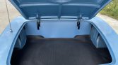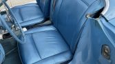 The cabin features seats trimmed in blue vinyl as well as a matching dashboard. Equipment includes a dashboard-mounted rear-view mirror, carpeted floor mats, black lap belts, an analog clock, metal sill plates, and a Wonder Bar push-button radio.