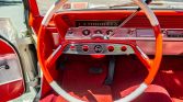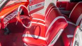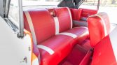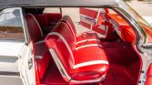 The interior features front and rear bench seats reupholstered in pleated red vinyl with white longitudinal stripes. Bright aluminum inserts on the matching door panels correspond with the dashboard fascia, and the red carpeting is protected by Impala-embroidered floor mats.