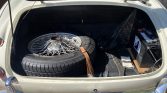 Black-finished 15″ wire-spoke wheels have two-ear knock-off centers and were mounted with 185/70 Vredestein Sprint Classic tires in 2020. A full-size spare wheel with a Nexen tire is mounted in the trunk. The front suspension was overhauled in 2012.