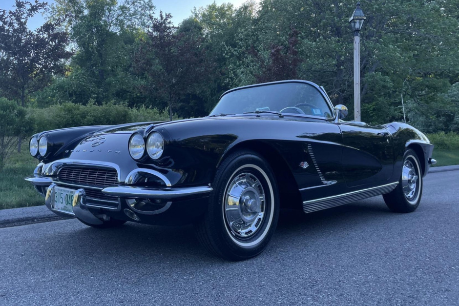 This 1962 Chevrolet Corvette was refurbished under previous ownership and is finished in Tuxedo Black over a matching vinyl interior. Power is provided by a 327ci V8 mated to a replacement Muncie four-speed manual transmission. Equipment includes a Wonderbar push-button AM radio, electronic ignition, a Hurst shifter, and whitewall tires. Work since the seller’s 2018 purchase reportedly included replacing the soft top and installing LED headlamps, while more recent service included replacing the shocks and spring shackles as well as changing the engine oil.