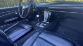 The cabin features bucket seats trimmed in black vinyl along with a matching dashboard, door panels, and carpets. Amenities include a Hurst shifter, a dash-mounted rearview mirror, an analog clock, and a disconnected Wonderbar push-button AM radio.