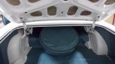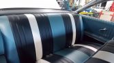 The cabin features two rows of bench seats that were reupholstered in blue vinyl with black and white stripes by CJ’s Upholstery of Greenback, Tennessee. Black rubber mats line the blue carpets, and the radio and heater have been deleted.