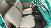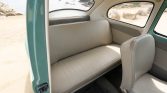 The cabin features front bucket seats and a rear bench trimmed in beige vinyl along with two-tone door panels, gray carpets, and a body-color dashboard. Equipment includes rubber floor mats, a glovebox, vent windows, and a driver-door storage pouch. The seat frames were reportedly powder-coated during the refurbishment.