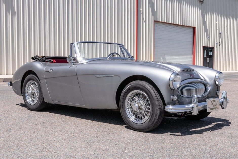 This 1963 Austin-Healey 3000 BJ7 Mk II is a 2+2 convertible that was acquired by the seller and her late husband in 1984. Finished in silver over red upholstery, it is powered by a 2.9-liter inline-six paired with a four-speed manual transmission with overdrive. Equipment includes a black convertible soft top, door-mounted mirrors, front disc brakes, a rear luggage rack, and chrome-finished 15″ knock-off wire wheels. Maintenance in preparation for the sale included a brake service, an…