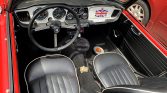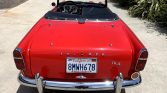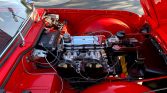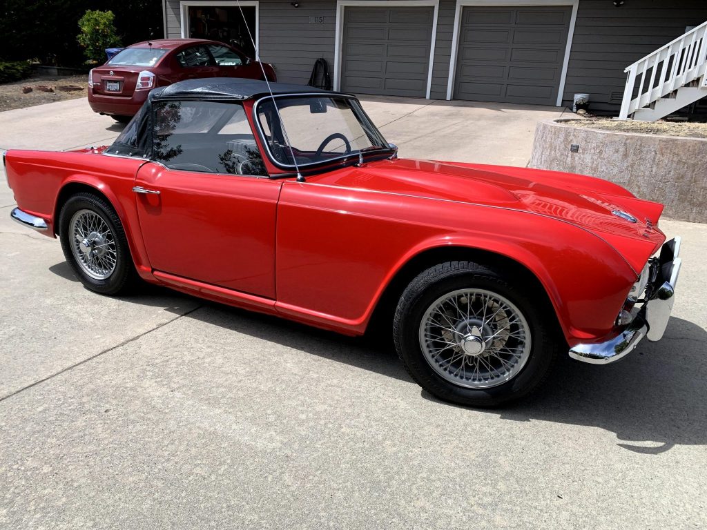 This 1963 Triumph TR4 is finished in red with a black convertible top over a black vinyl interior and powered by a 2.1-liter inline-four mated to a four-speed manual transmission. Subsequent service included removing, refinishing, and resealing of the drivetrain, refinishing the chassis and engine bay, overhauls of the carburetors, suspension, and braking systems, replacement of the exhaust system and ignition components, and more as detailed below.