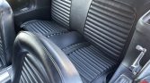 The interior features front bucket seats and a rear bench trimmed in black vinyl joined by a matching dashboard, door panels, and carpets. Lap belts are equipped for front occupants, and amenities include a center console, vent windows, an aftermarket AM/FM cassette stereo, and Mustang-branded floor mats.