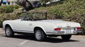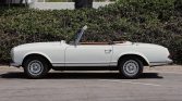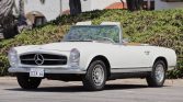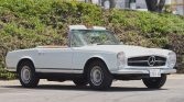 This 1964 Mercedes-Benz 230SL is powered by a replacement 2.8-liter inline-six paired with a four-speed manual transmission and is finished in Light Ivory over Bamboo MB-Tex. Equipment includes a brown convertible top, a removable hardtop, 14″ Bundt alloy wheels, and a heater.