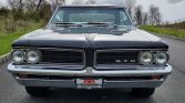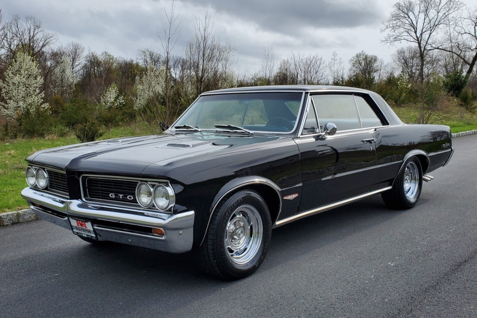 This 1964 Pontiac GTO hardtop is said to have undergone refurbishment circa 2012 and has been refinished in black over blue vinyl with power supplied by a replacement 455ci V8 mated to a four-speed manual transmission. Equipment consists of Tri-Power carburetion, an electronic ignition, power steering, power front disc brakes, long-tube headers, Flowmaster mufflers, a limited-slip differential, and an Edelbrock rear sway bar.