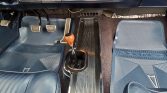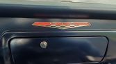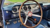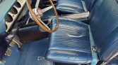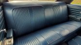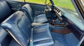 The cabin has been reupholstered in blue vinyl with a matching dashboard and door panels and black carpeting protected by blue rubber mats. Features include a heater/defroster, a center console, a radio-delete plate, and front lap belts.