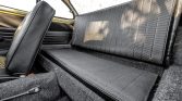 The cabin features front bucket seats upholstered in black leather with black and yellow houndstooth fabric inserts. The door panels were sourced from a 1967 Porsche 912 featuring long pockets, and the carpeting is a gray square-weave German wool. Additional interior features include body-color metal with a black upper dashboard, crank windows, a folding rear bench seat, a Blaupunkt radio, and a sliding fabric sunroof.