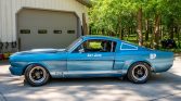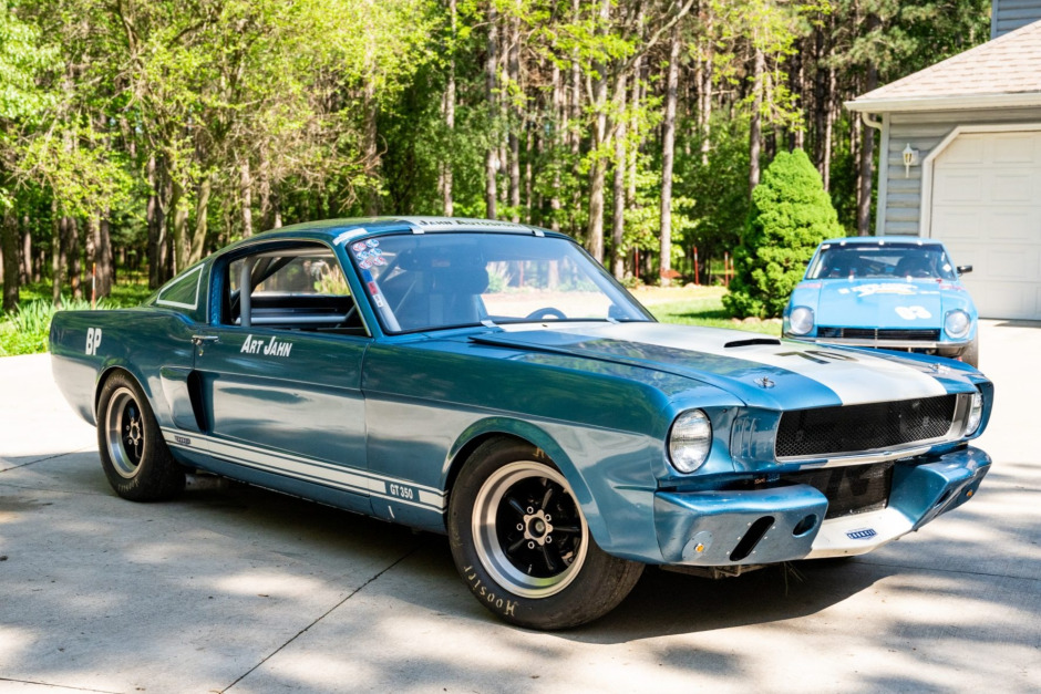 This 1965 Ford Mustang fastback was modified as a Shelby GT350R tribute under prior ownership. Refinished in blue with white stripes over a stripped interior with fixed-back bucket seats, the car is powered by a modified 347ci V8 paired with a four-speed Richmond manual transmission with straight-cut gears. Other equipment includes a 9″ rear axle, disc brakes, 15″ wheels, aftermarket suspension, side-exit exhaust, a roll cage, racing harnesses, a fire-suppression system, AutoMeter gauges, a vented rear window, and R-style bodywork. The seller purchased the car in 2016 and used it to win the MCSSC GT-1 class championship in 2019.