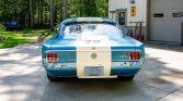 The car was delivered new in Silver Blue (Y) and has been refinished in blue with white stripes. The single-scoop hood, front apron, side scoops, and vented plexiglass rear window are intended to resemble those of period GT350R racing cars. The rear bumper has been removed, and the side-exit exhaust system terminates ahead of each rear wheel.