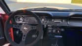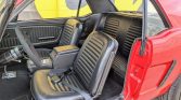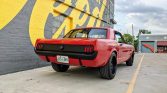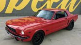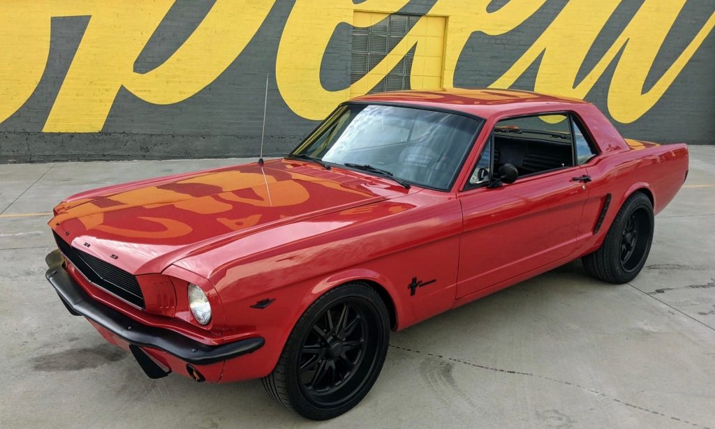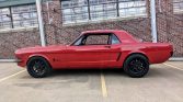 This 1965 Ford Mustang coupe has been refinished in red over a refreshed black interior and is powered by a fuel-injected 347ci V8 is paired with a four-speed automatic transmission. Equipment includes an E303 camshaft, GT40 cylinder heads, an 8″ rear axle with a 3.55:1 gear ratio, 18″ wheels, four-wheel disc brakes, an aftermarket sound system, an armrest console, and black exterior trim.