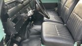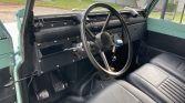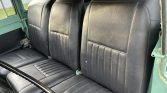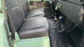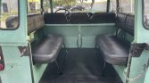 The interior features three individual front seats trimmed in black vinyl along with matching troop-style rear seats. Amenities include windshield vents, black rubber floor coverings, aftermarket shift knobs, a glove compartment, and a column-mounted turn signal lever.