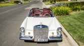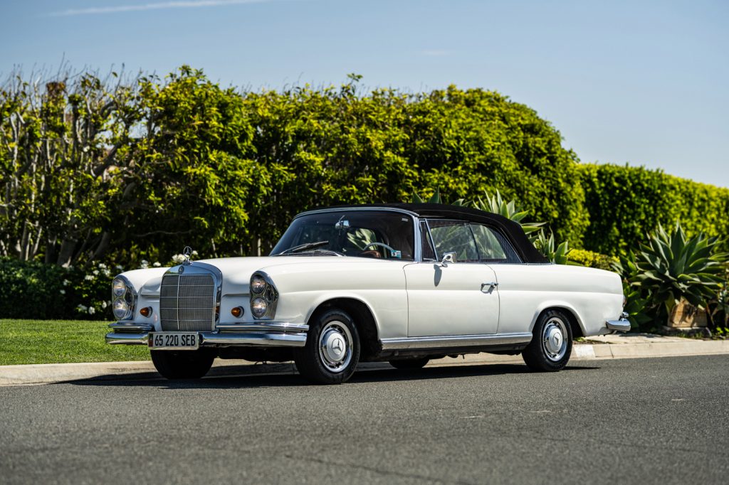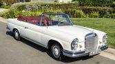 This 1965 Mercedes-Benz 220SE cabriolet is a US-spec model that was reportedly acquired by its original owner in Portugal through the European Delivery Program. Finished in white with a black soft top over red leather, the car is powered by a fuel-injected 2.2-liter M127 inline-six paired with a four-speed automatic transmission. The suspension and steering systems were refreshed during previous ownership, and the car was acquired by the seller in July 2018. Work has since included a rebuilt water pump, re-cored radiator, a valve job, and a replacement cylinder head gasket, fuel pump, thermostat, shift column bushing, rear shocks, and brake components.