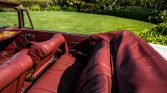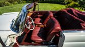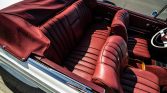The cabin features red leather seats along with a matching dashboard, door panels, and carpets. Amenities include power-assisted steering and brakes, an analog clock, and a Blaupunkt Europa push-button AM/FM radio that was replaced in 2019.