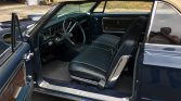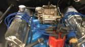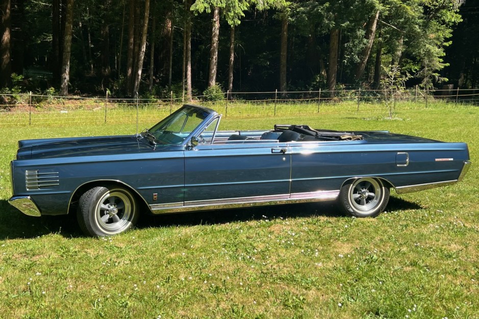 This 1965 Mercury Park Lane two-door convertible is finished in Dark Blue Metallic over blue vinyl upholstery. Power is from a 390ci V8 mated to a three-speed automatic transmission, and equipment includes a power-operated tan soft top, 15″ American Racing Torq Thrust wheels, a Holley four-barrel carburetor, power-assisted steering, power-assisted front disc brakes, dual electric fans, and an AM/FM radio.