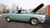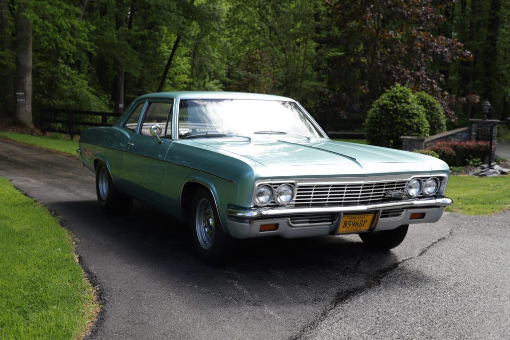 This 1966 Chevrolet Bel Air is a two-door sedan that was refurbished during previous ownership and acquired by the current owner in 2018. The body is finished in light turquoise over a black vinyl interior, and power is powered by a 454ci V8 paired with a TH400 three-speed automatic transmission. Features include front disc brakes, four-link rear suspension, an adjustable Panhard rod, bucket seats, and a dual exhaust system with Flowmaster mufflers.