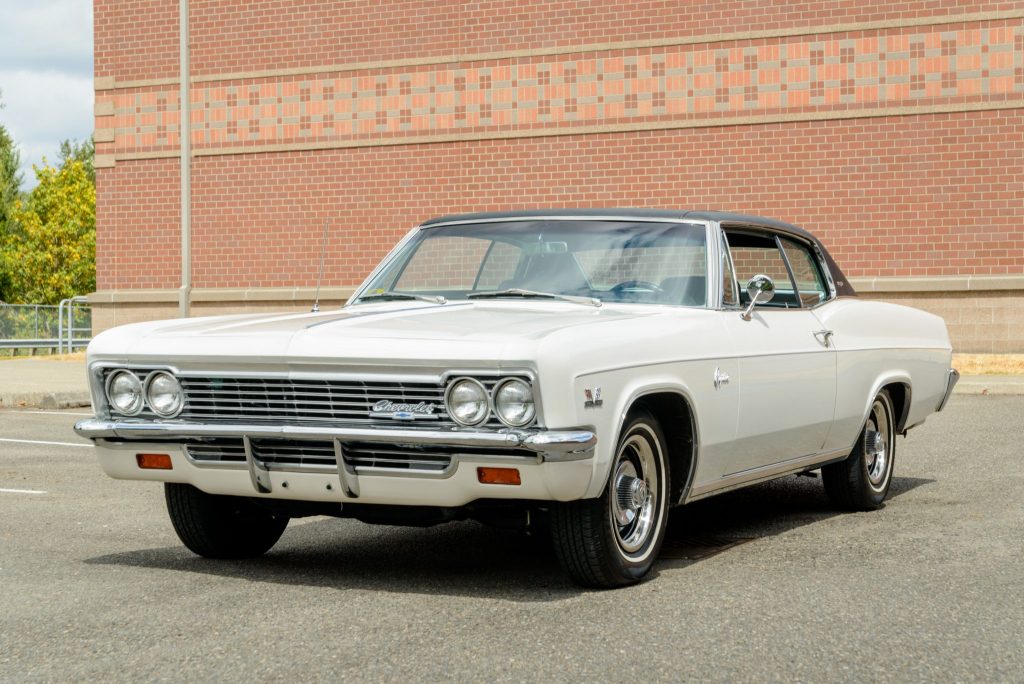 This 1966 Chevrolet Caprice was purchased new by the seller’s father in 1966 and is said to have undergone a seven-year refurbishment that concluded in 1998. The car was subsequently sold to a family friend and later reacquired by the seller’s father in 2013 and gifted to the seller. It is finished in white with a black vinyl roof over a black interior and is powered by a 396ci V8 paired with a three-speed automatic transmission. Equipment includes chrome bumpers, 15” wheels, power windows, and an AM/FM cassette stereo.