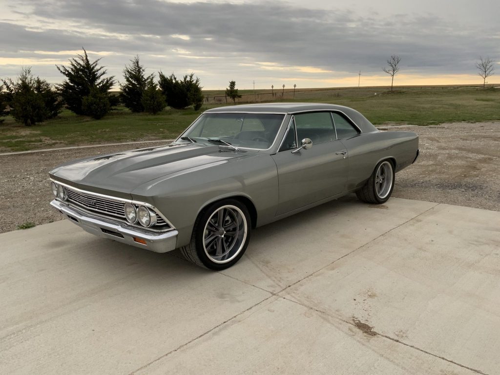 This 1966 Chevrolet Chevelle Malibu coupe was acquired by the seller in 2014 as a rolling project and has since been modified with a 6.0-liter LS2 V8 and a 4L65E four-speed automatic transmission. Additional modifications include a 3.55 Positraction rear end, four-wheel disc brakes, 18″ Chip Foose wheels, a cowl induction hood, and aftermarket control arms. The car was repainted metallic gray and the interior features black vinyl and suede seats, Vintage Air GenIV air conditioning, Dakota Digital gauges, and a hidden Bluetooth-enabled stereo system.