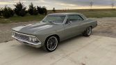 This 1966 Chevrolet Chevelle Malibu coupe was acquired by the seller in 2014 as a rolling project and has since been modified with a 6.0-liter LS2 V8 and a 4L65E four-speed automatic transmission. Additional modifications include a 3.55 Positraction rear end, four-wheel disc brakes, 18″ Chip Foose wheels, a cowl induction hood, and aftermarket control arms. The car was repainted metallic gray and the interior features black vinyl and suede seats, Vintage Air GenIV air conditioning, Dakota Digital…