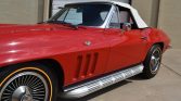 This 1966 Chevrolet Corvette convertible is powered by a 327ci V8 paired with a four-speed manual transmission and is finished in red over black vinyl. The car was refurbished circa 2014. Work in preparation for the sale involved replacing the coolant expansion tank, voltage regulator, right rear brake caliper, and hardware for the body-color removable hardtop. Equipment includes a white soft top, turbine-style wheels, four-wheel disc brakes, a rear luggage rack, a side-exit exhaust system, and a push-button radio.