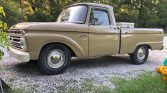 This 1966 Ford F-100 is a short-bed styleside pickup finished in bronze and is powered by a replacement 200ci Thriftpower inline-six paired with a three-speed automatic transmission. Equipment includes a woven bench seat cover, a steel storage box in the bed, a sliding rear window, Holley Sniper electronic fuel injection, an MSD electronic ignition system, Saginaw power steering, front disc brakes, and a suspension system said to lower the ride height by 3″. Refurbishment work under prior ownership is said to have included a repaint along with the installation of the replacement engine and transmission and overhauls of the brake and suspension systems.