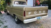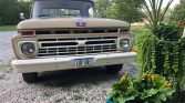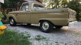 This 1966 Ford F-100 is a short-bed styleside pickup finished in bronze and is powered by a replacement 200ci Thriftpower inline-six paired with a three-speed automatic transmission. Equipment includes a woven bench seat cover, a steel storage box in the bed, a sliding rear window, Holley Sniper electronic fuel injection, an MSD electronic ignition system, Saginaw power steering, front disc brakes, and a suspension system said to lower the ride height by 3″. Refurbishment work under prior…