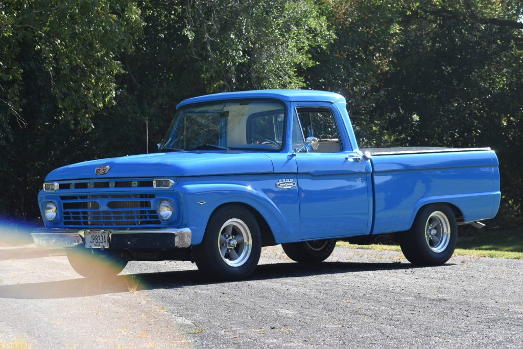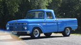 This 1966 Ford F-100 is a short-bed Styleside 4×2 pickup that is finished in Medium Blue over light beige vinyl and is powered by a replacement 302ci V8 paired with three-speed automatic transmission. Equipment includes an Edelbrock carburetor, a Weiand intake manifold, a performance camshaft, a B&M shifter, 15″ wheels, a lowered suspension, power steering, power-assisted brakes, a RetroSound radio, and a tilt-adjustable steering column.