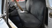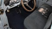 The bench seat has been reupholstered in blue vinyl with textured cloth inlays and the blue carpet has been replaced. Features include white door panels, three-point seatbelts, a TMI dash pad, and Stinger sound dampening has been added to the floor and firewall.