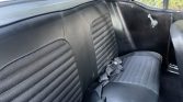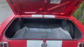 The interior features front bucket seats and a rear bench that have been reupholstered in black vinyl along with matching door panels and carpeting. The front bucket seats wear Shelby Cobra GT350 patches and additional amenities include a push-button radio, faux-woodgrain dash trim, lap belts, and vent windows.