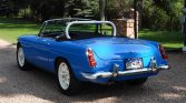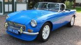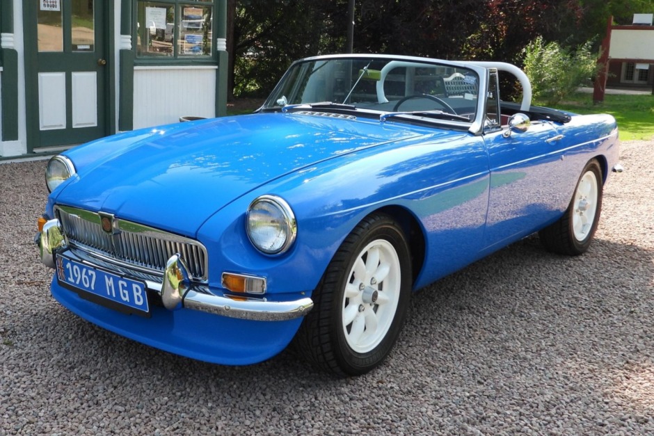This 1966 MGB roadster was acquired by the seller in September 2009 and subsequently refurbished, with changes including bodywork revisions, a repaint in blue, reupholstering the cabin, and installing a roll hoop, white-painted Minilite-style wheels, and a reproduction banjo-style steering wheel. Power is from a replacement 1.8-liter inline-four paired with a four-speed manual transmission, and equipment includes chrome bumpers with overriders, a black tonneau cover, rubber floor mats, a fire extinguisher, and a lockable glovebox.