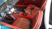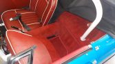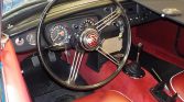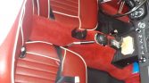 The cabin features seats trimmed in red upholstery with white piping as well as matching door panels and carpets, a black dashboard, and rubber floor mats. The dashboard houses a lockable glovebox, and a cupholder is mounted to the transmission tunnel. Other equipment includes adjustable vent windows, lap belts, and a fire extinguisher.