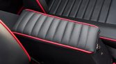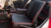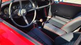 The seats were rebuilt and reupholstered in black leather with red piping, and matching replacement wool carpets, door panels, and a leather dash pad with red stitching were also installed. The interior work was performed by Reyes Upholstery in Anaheim, California, and amenities include front bucket seats with lap belts, Jensen speakers mounted in the rear bulkhead, and a wood-finished shift knob.